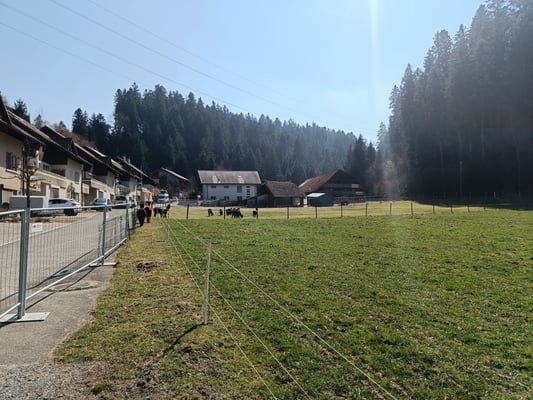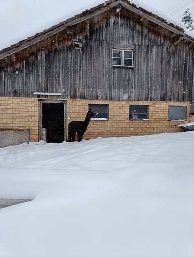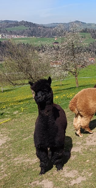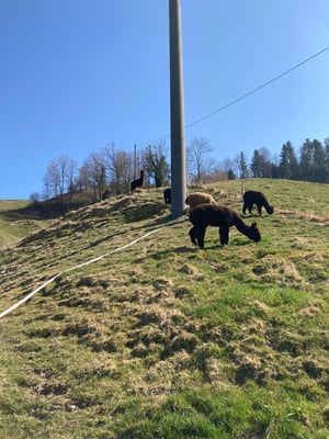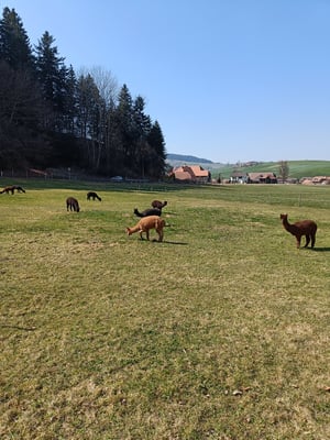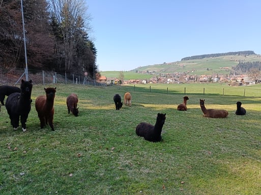 Die Alpakas geniessen bei den warmen Sonnenstrahlen die ersten grünen Grashalmen. Die Stuten in Zäziwil und die Hengste im Entlebuch.